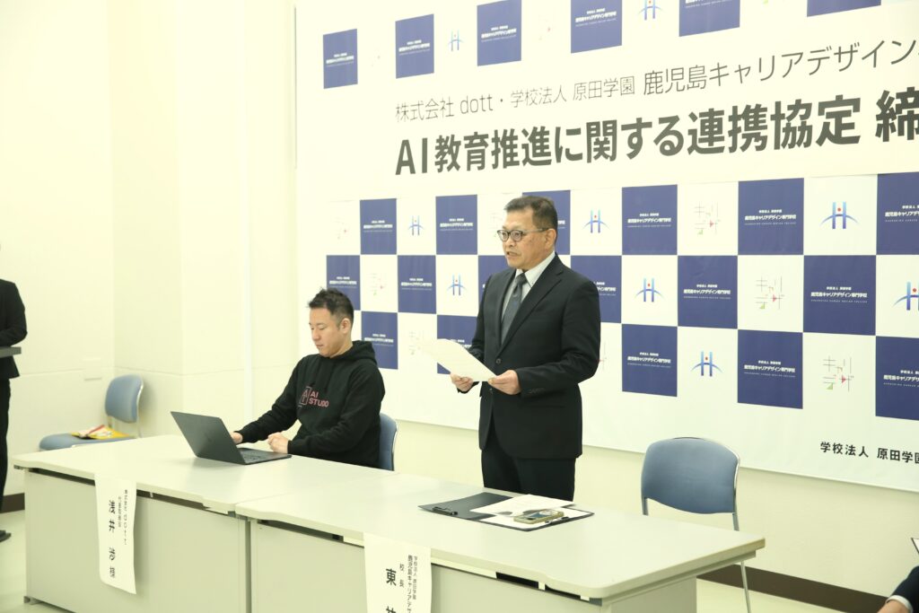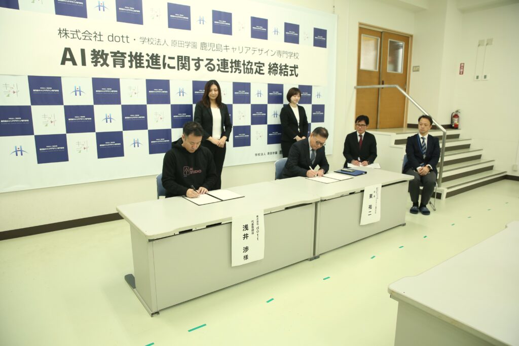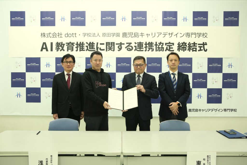AI教育プログラム「AI STUDIO」を運営する株式会社dott(本社:東京都台東区、代表取締役:浅井渉様)と、学校法人原田学園 鹿児島キャリアデザイン専門学校は、全産業分野で求められるAI活用人材の育成を推進するため、鹿児島県内の専門学校として初となる株式会社dottとのAI教育推進に関する連携協定を締結いたします。