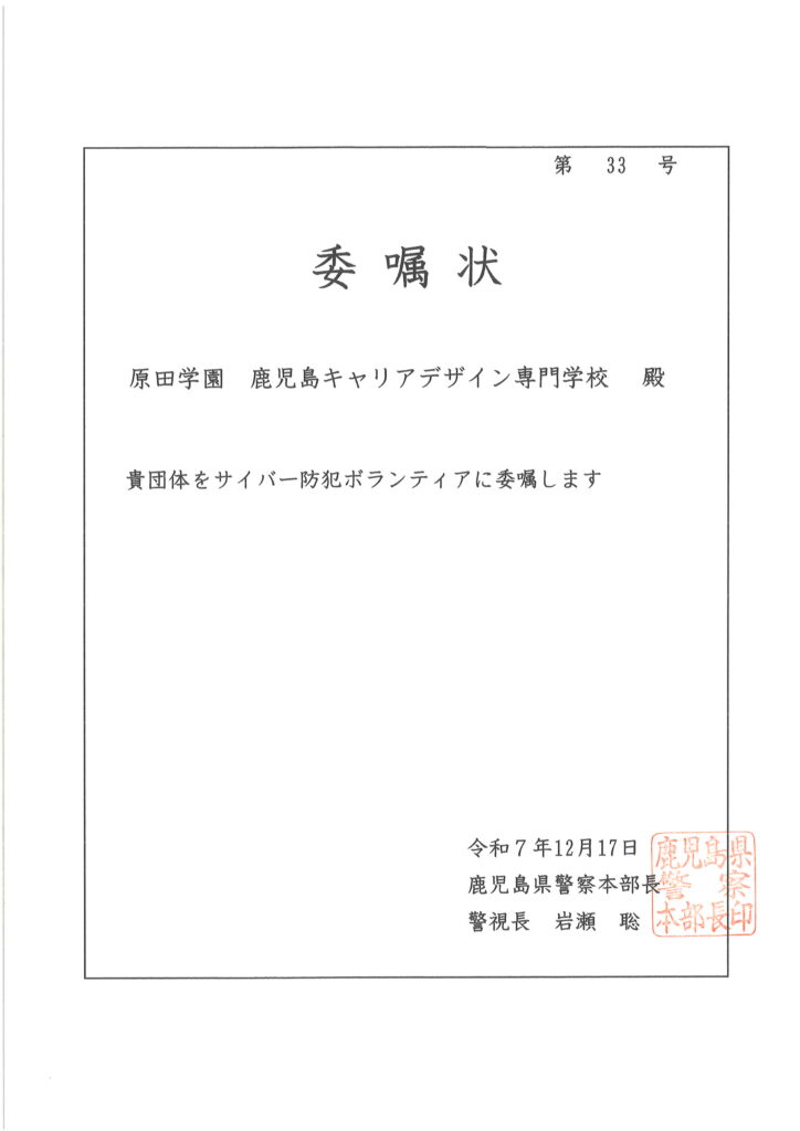 この活動は、県内大学・専門学校・高校に呼びかけられ、本校と姉妹校の鹿児島情報高校は県内で2校の団体委嘱校として、また、本校学生も個人として、鹿児島県警察本部長から委嘱状が交付されました。