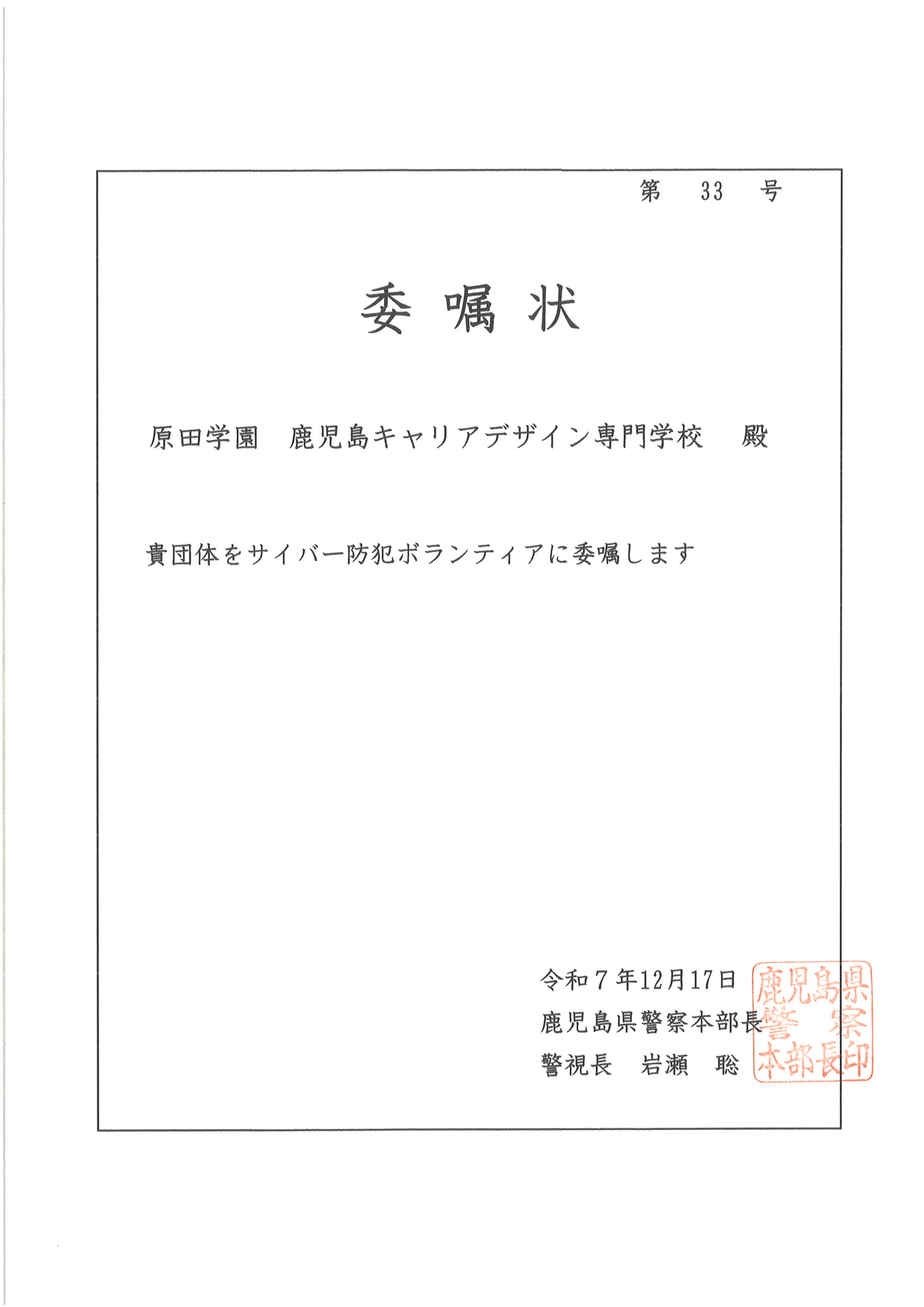 この活動は、県内大学・専門学校・高校に呼びかけられ、本校と姉妹校の鹿児島情報高校は県内で2校の団体委嘱校として、また、本校学生も個人として、鹿児島県警察本部長から委嘱状が交付されました。