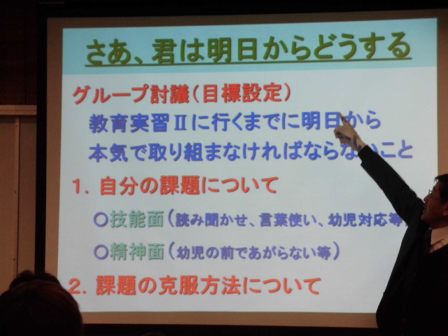 それぞれの実習を前に,姉妹園でもある「こまつばら幼稚園」の園長先生から講話をいただきました。
