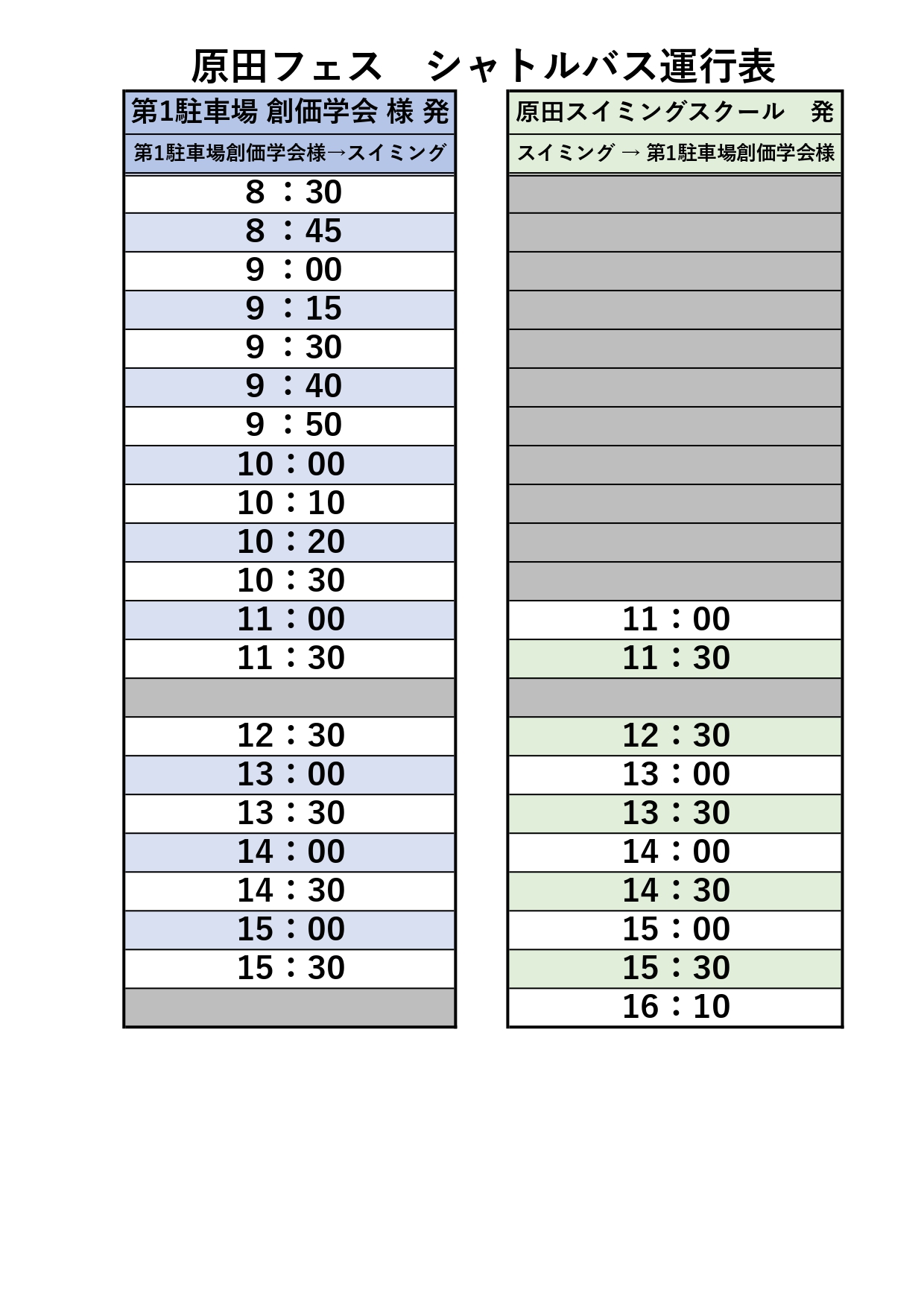 当日はシャトルバスを運行しております、時刻表をご確認下さいませ。