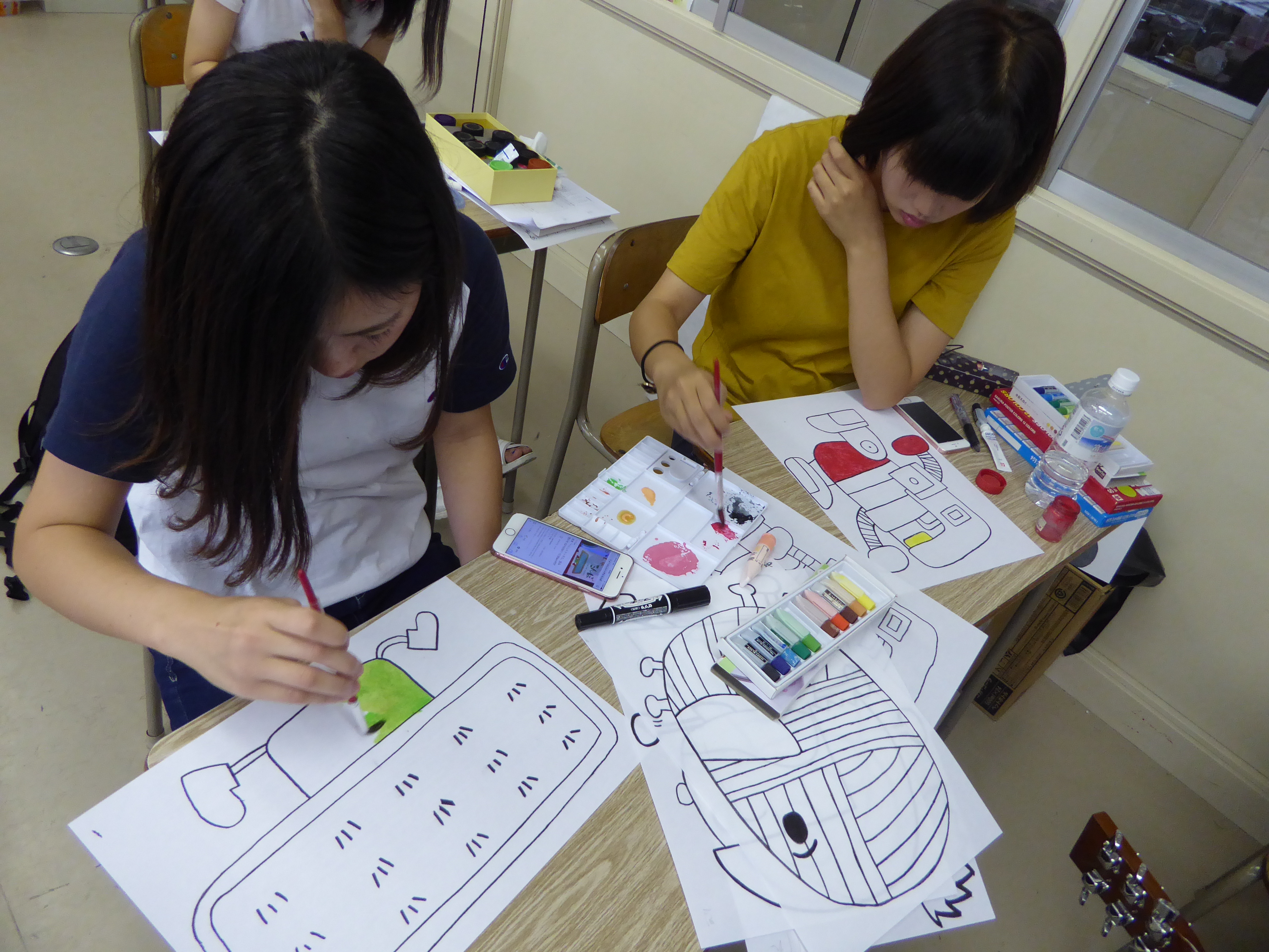 まずはロケットを作りました。学生たちが作り方を教えています。