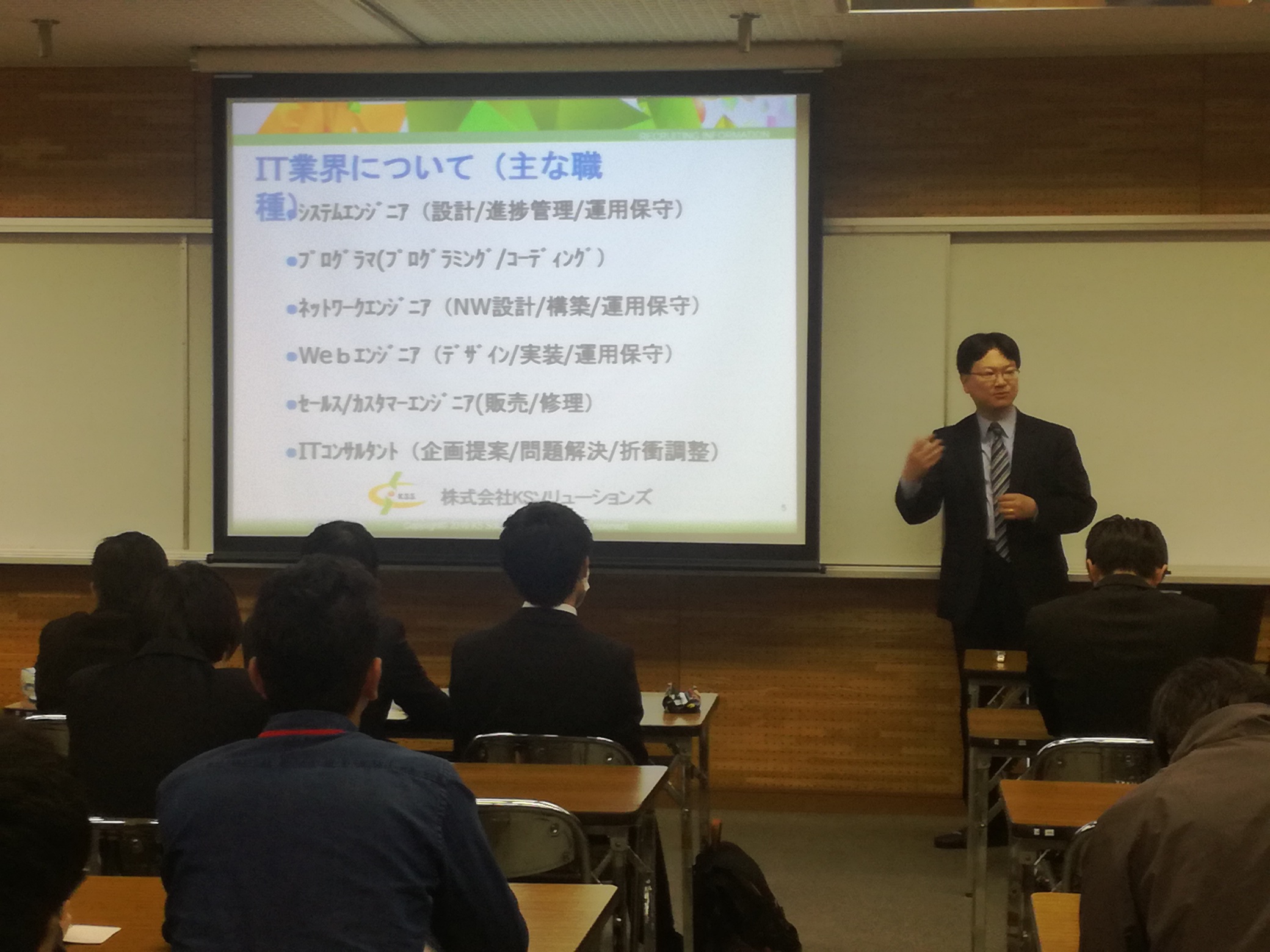 職員の方から展示物の説明を受け、興味津々の学生たち。